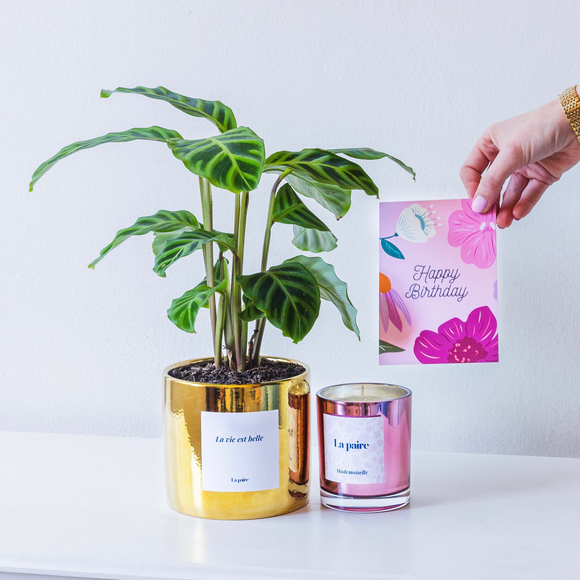 Includes: Calathea Plant in Gold Pot, Mademoiselle Scented Candle, and Floral Happy Birthday Card